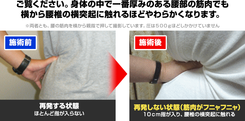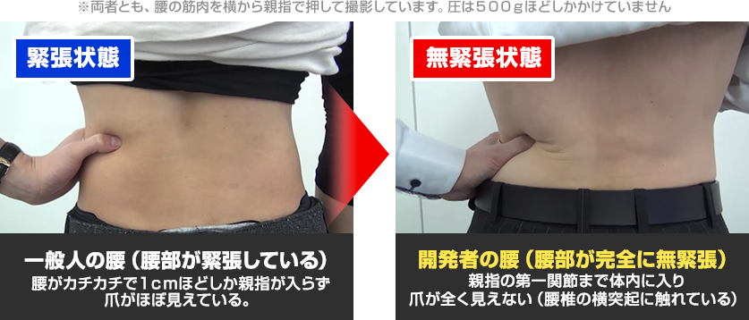 先生、腰に横から指をあててみてください。腰椎の横突起に触れますか? 緩消法によって本当に症状が完治した患者さんは、みんな指で腰椎の横突起が触れます。本来であればこのレベルまで筋肉が弛緩できてはじめて“完治”ということができるのです。