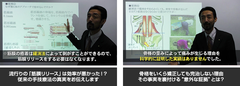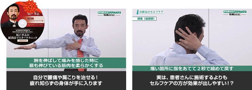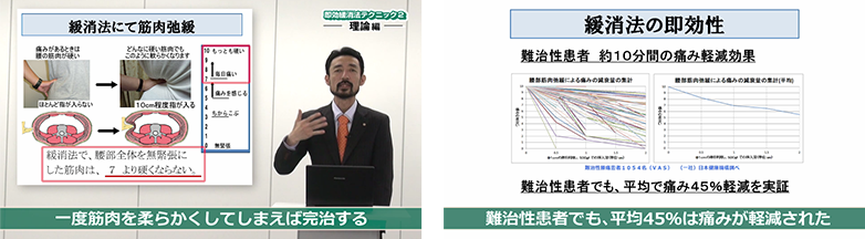 この映像を見れば、緩消法の理論から、痛みの専門家しか知らない「人体の真実」まで一括で知ることができます。患者さんからの唐突な質問にも一切詰まることなく、スパッと答えてあげられるようになるので、必然的に信頼関係を築けることでしょう。