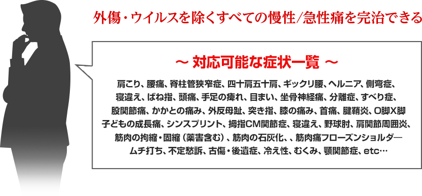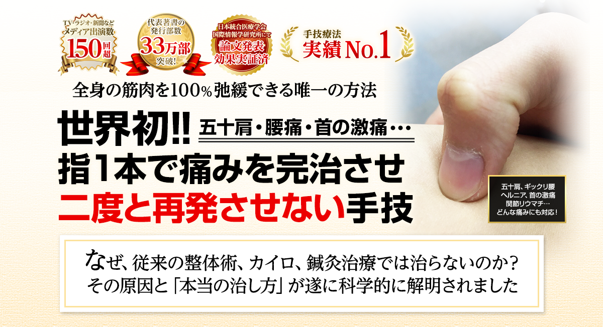 外傷・ウイルスを除いた慢性・急性疼痛の「真の原因」を科学的に解明し、確実に筋肉を弛緩させ痛みが消せるようになった治療法はこの手技を除けば、世界中のどこを探しても他にありません。