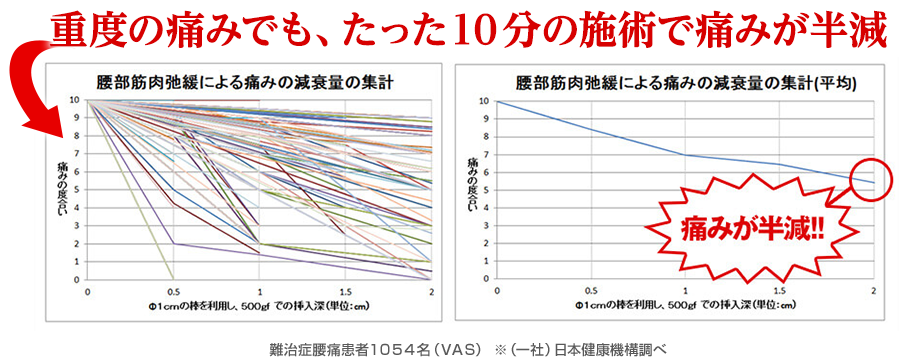 さらに、1000名以上の患者さんのご協力のもと「たった10分の施術で痛みが半減する」ことが分かりました。