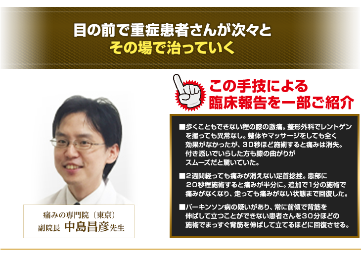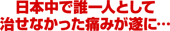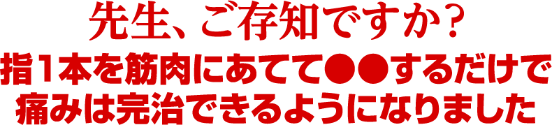先生、ついに痛みを『完治』させられる治療法が完成したのです。それも薬や機械などではなく、先生が専門とする“手技療法“の世界でそれが生まれたのです。