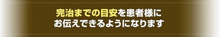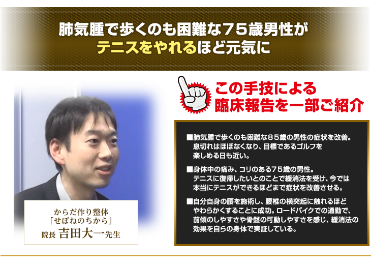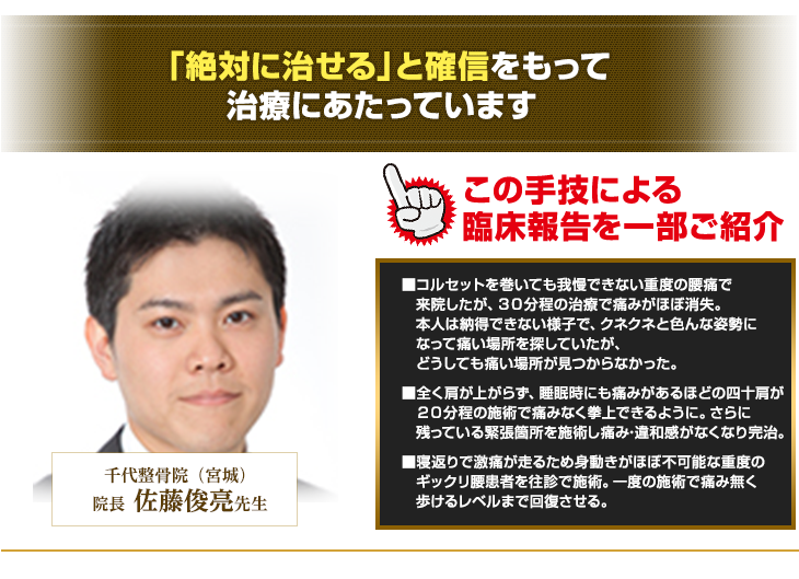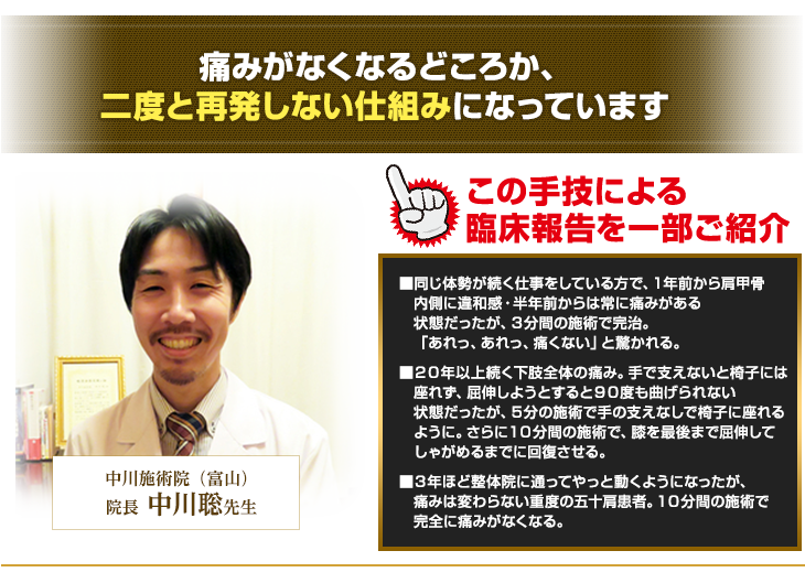 どれも今までの方法では得る事のできない結果でした。 本当に人の役に立てる方法に出会えたと思います。これからは多くの方々が痛みから解放され、喜んでいただけるよう貢献していきます。